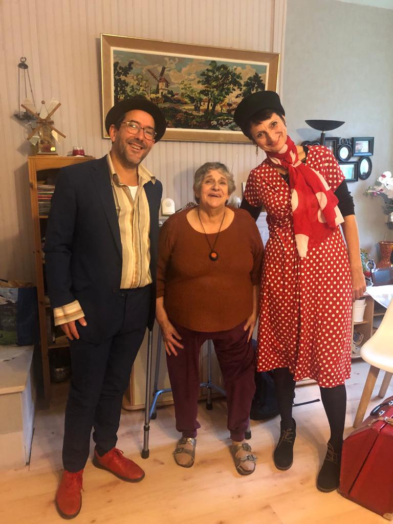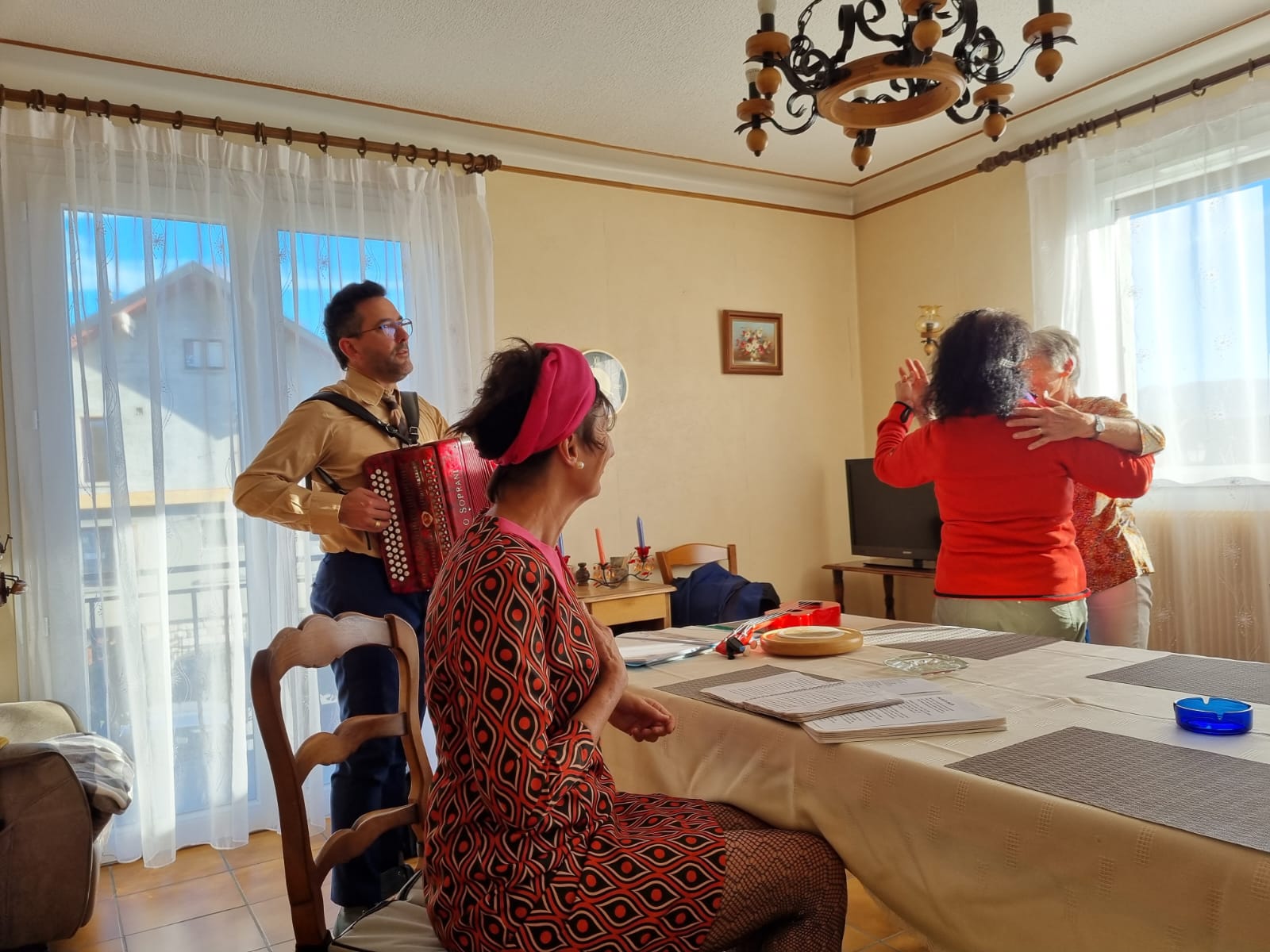 Les bénéficiaires accueillent les artistes dans leur cuisine, leur salon ou encore dans leur jardin. Un cadeau offert en tout intimité, aux bénéficiaires des aides et leur famille pour un moment joyeux et émouvant. L’occasion de se raffraichir la mémoire autour de chansons connues mais aussi de découvrir de la poésie, des textes inédits. Un moment unique pour chaque personne. On chante, on danse parfois, on rit et on pleure.